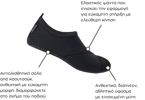 Τα Fitkikcs, μπορούν να φορεθούν παντού! Απο το γυμναστήριο, το σπίτι, την απογευματινή βόλτα μέχρι την παραλία. Η σκληρή σόλα τα κάνει ιδανικά για κάθε επιφάνεια και το ελαστικό και αναπνεύσιμο ύφασμα τους αγκαλιάζει το πέλμα σας, προσφέροντας άνεση και ξεκούραση στα πόδια...